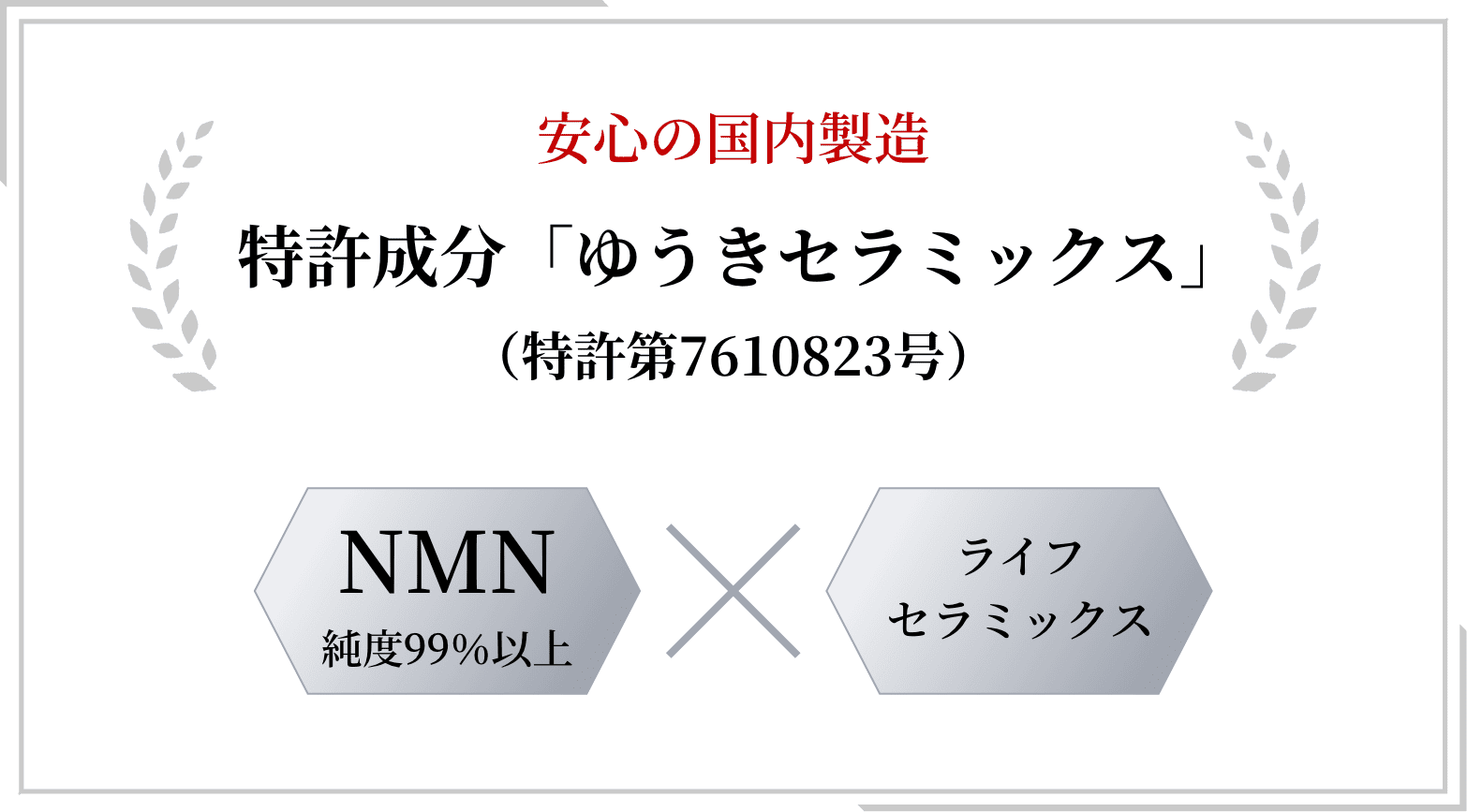 NMNとライフセラミックスのかけ合わせこそが特許取得成分である「ゆうきセラミックス」なのです。